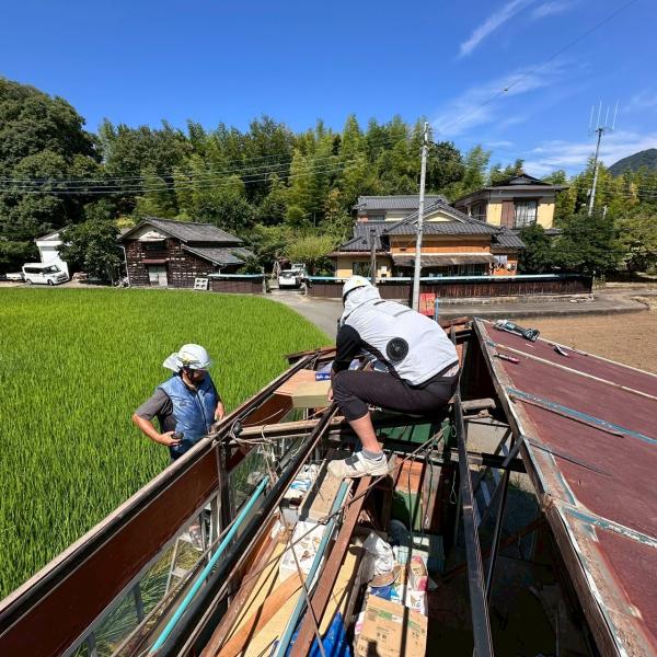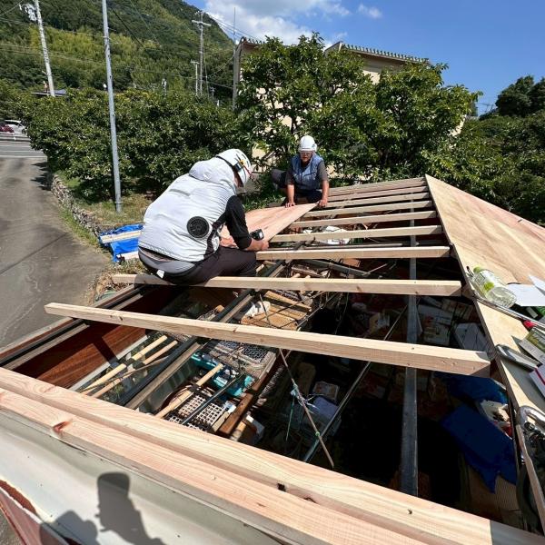既存のトタン屋根及び下地材を剥がしてるところです。剥がし終えたら、ホコリやゴミなどを掃除します。今回は下地も傷んでいた為、下地と屋根材を交換します。