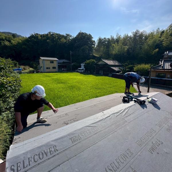 屋根の低い所から高い所に向かって防水シートを敷いていきます。防水シートは屋根材の隙間から入った雨水が、屋根の下に浸透させないようにする役割があります。今回はガルバリウム鋼板を仕様したため粘着型の防水シートを使用しました。