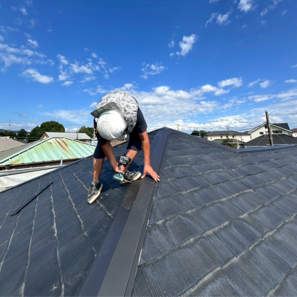 棟包みを抜き板にステンレス製釘で固定していきます。最後の仕上げとなる棟板金の取り付けをします。棟包みは勾配のある屋根であればどの住宅にもある部位です。棟は漏水リスクが特に高い場所のため棟包みは確実な防水機能が求められています。