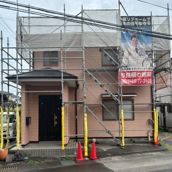 外壁や軒裏など高い所も安全・丁寧に塗装するために、足場を組み立てます。ご近所に迷惑が掛からないよう、飛散防止ネットを使用することで塗料や高圧洗浄時の汚れなどが飛散するのを防ぎます。