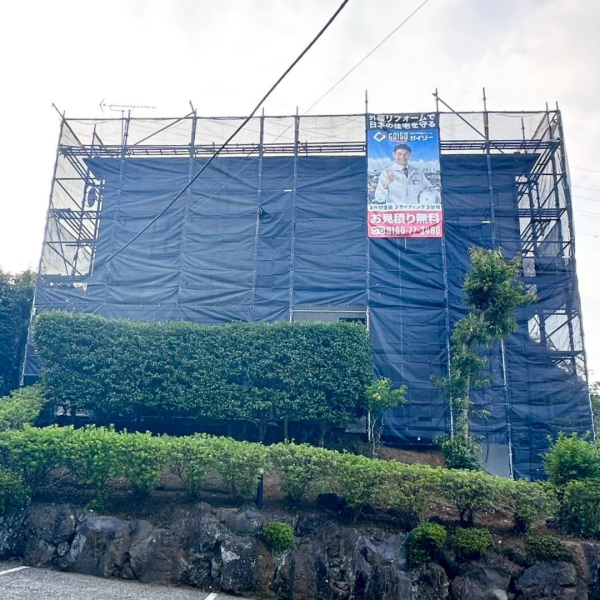 外壁や軒裏など高い所も安全・丁寧に塗装するために足場を組み立てます。ご近所に迷惑が掛からないように飛散防止ネットを使用することで塗料や高圧洗浄時の汚れなどが飛散するのを防ぎます。