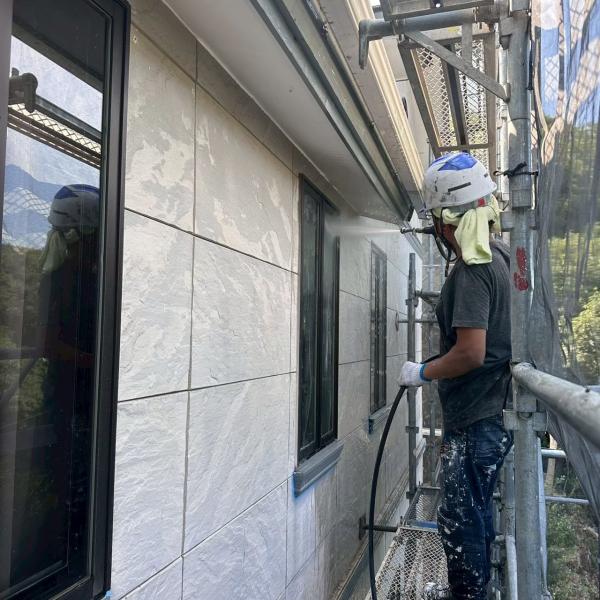 汚れなどが付着したまま塗装をすると、塗装面と塗料がしっかりと密着せず、塗装後に塗膜のひび割れや剥がれなどに繋がってしまうため、塗装を長持ちさせるためには大事な工程です。屋根を洗浄し、汚れや付着物を除去していきます。今回は無機塗料を使用するためガイソーパワークリーナーを使って外壁、屋根を洗浄することで埃や油、古い塗膜だけでなくカビや苔の根まで洗い流します。パワークリーナーは原液を水で希釈し、外壁や屋根に噴霧します。その後、高圧洗浄で洗い流していきます。