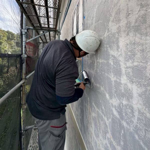 劣化したコーキングを取り除き外壁の繋ぎ目やサッシ周りなどの隙間をシーリング材で充填していきます。今回は期待耐候年数20年の超高耐候性シーリング、オートンイクシードを使用させていただきました。