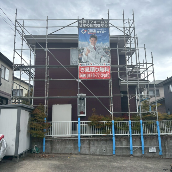 外壁や軒裏など高い所も安全・丁寧に塗装するために足場を組み立てます。ご近所に迷惑が掛からないように飛散防止ネットを使用することで塗料や高圧洗浄時の汚れなどが飛散するのを防ぎます。