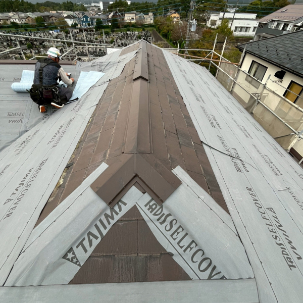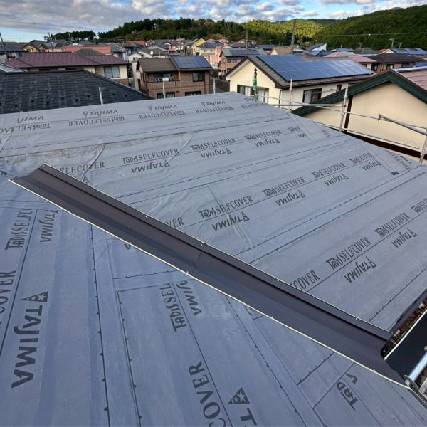 屋根の低い所から高い所に向かって防水シートを敷いていきます。防水シートは屋根材の隙間から入った雨水が、屋根の下に浸透させないようにする役割があります。今回はガルバリウム鋼板を仕様したため粘着型の防水シートを使用しました。
