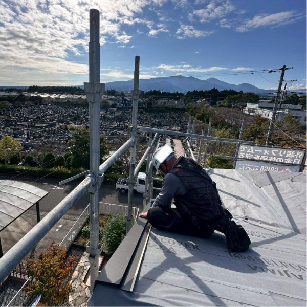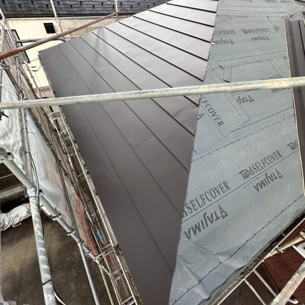 ガルバリウム鋼板を葺いていきます。ガルバリウム鋼板は軽量で耐久性が高い素材です。他の素材と比べても優れた材料であることは間違いありませんが塗装工事に比べると費用は高額になります。ガルバリウム鋼板の塗膜保障は最低でも15年と建材の中でも長期の保証対象建材となります。