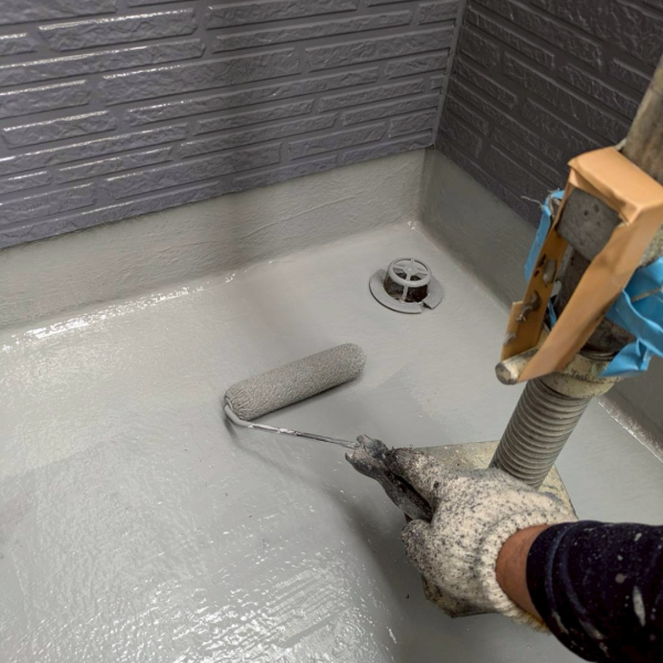 下地処理として防水工事専用のプライマーを塗布していきます。汚れた面に塗装をしてもしっかりと密着しません。高圧洗浄の後にこうした下地処理を行うことはとても重要です。