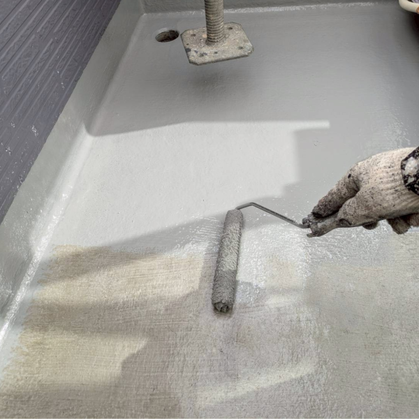 下塗り後はウレタン系防水塗料を施工していきます。中塗り・上塗りで使用するのは東日本塗料の弾性トップ14です。優れた耐水性で防水層を保護し、劣化を防ぐ塗料です。また防水工事はしっかりと排水がされるように、傾斜を考えて塗料を塗布していきます。