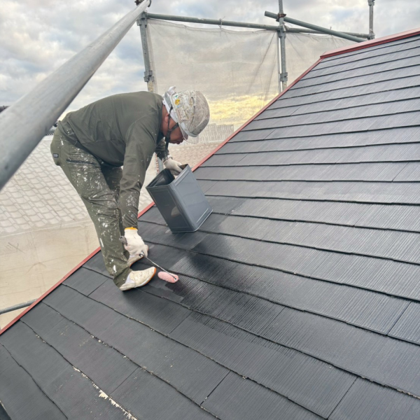 今回使用した塗料は期待耐候年数15年以上のアレスダイナミックルーフMUKIを使用させていただきました。紫外線や雨・風などに対して強い効果を発揮し、長期にわたり建物の美観を保つことができます。中塗りをすることで塗膜を厚くし、下地を保護する役割があります。