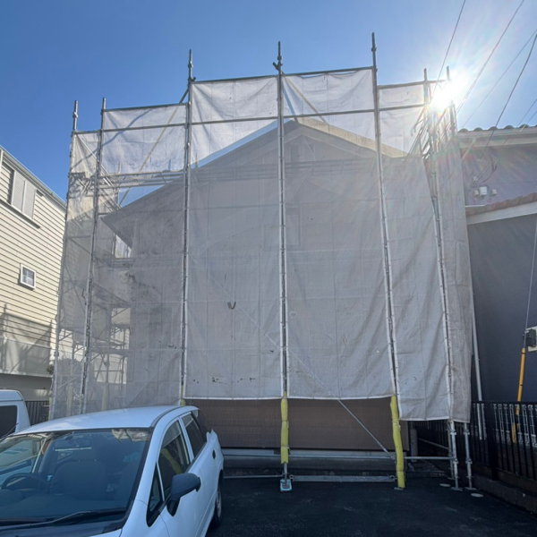 外壁や軒裏など高い所も安全・丁寧に塗装するために足場を組み立てます。ご近所に迷惑が掛からないように飛散防止ネットを使用することで塗料や高圧洗浄時の汚れなどが飛散するのを防ぎます。